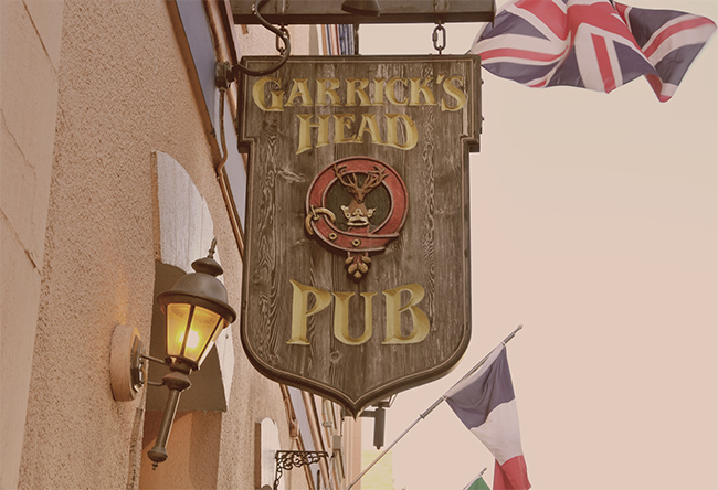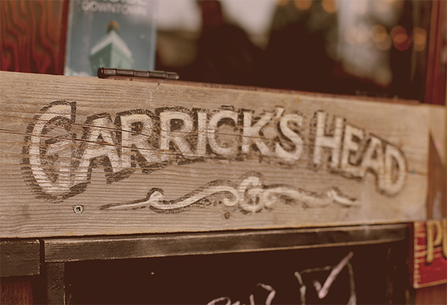 Over our 125+ years as a pub, Garrick's Head has seen many variations on our logo and style. Without a doubt, the elk head coat of arms mounted above our fireplace in the old pub is the root of all of our iconography; despite its foggy origins and backstory, this same imagery was used on the hanging tavern sign and also our windows.